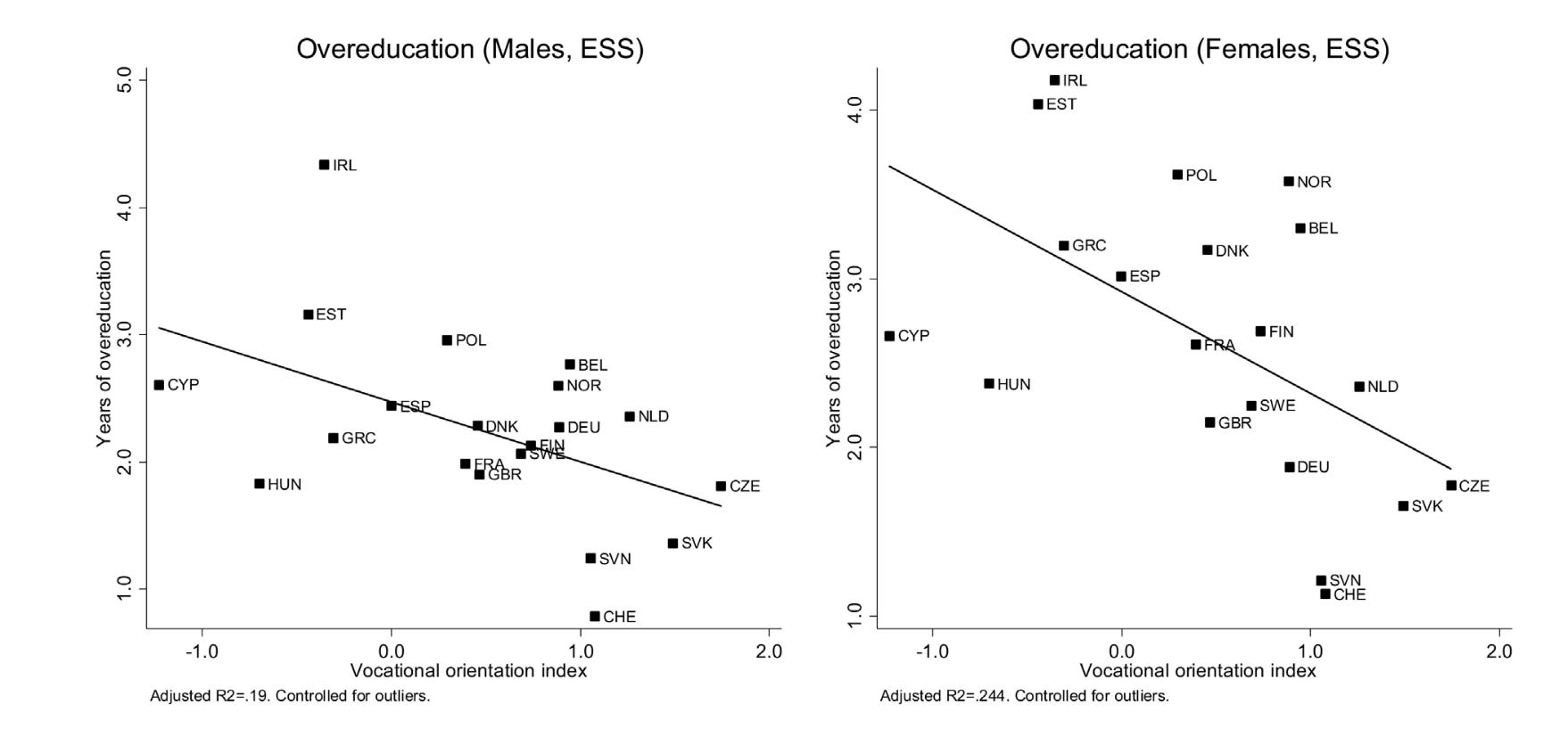 One important finding of our research was that overeducation is less prevalent in countries with a stronger vocational education and training system (in the European Social Survey of 2004, they had asked about the educational level required for the respondents’ current job, and comparing this to their educational level yields the measurement of overeducation). See the graph below from one of these papers.