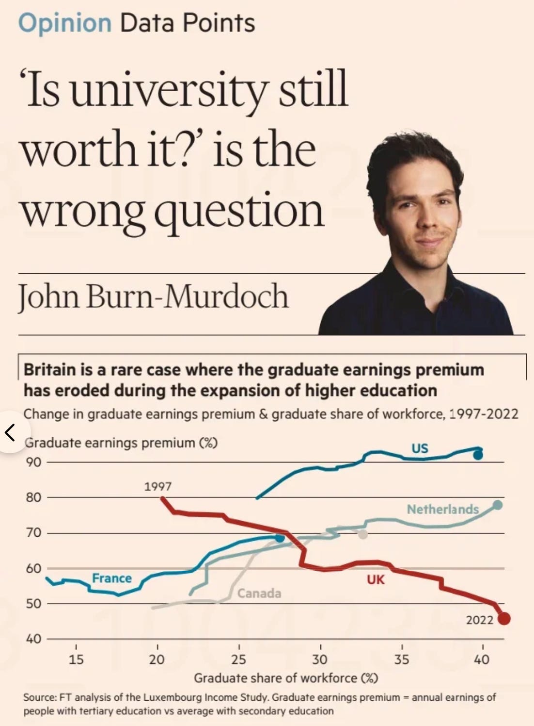 John Burn-Murdoch makes an interesting point in his recent column in the Financial Times: the wage premium of a university degree has stalled in the United Kingdom, unlike in other countries including the Netherlands and the United States, because the demand side (i.e. job structure) has not moved upwards as much. The share of managers and professionals has, for example, grown much faster in the other countries than in the UK. Many graduates in the UK therefore take up jobs below their educational level. Below a screenshot.