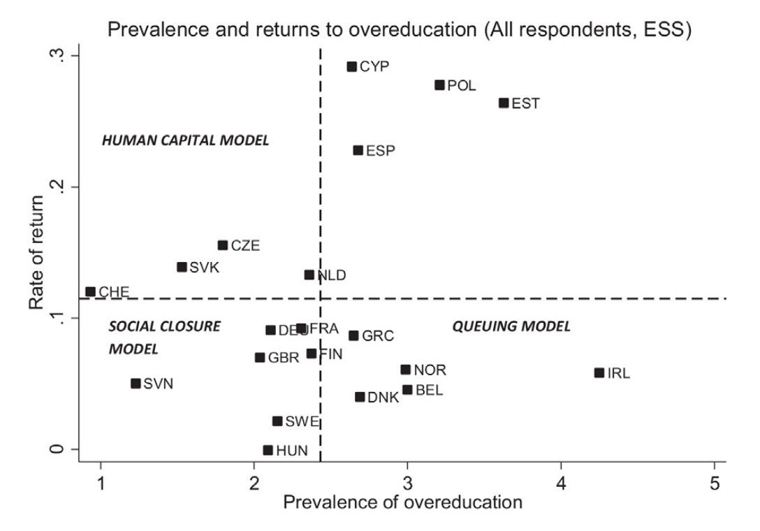 And the returns to overschooling, a sign of reward for human capital of workers independent of their occupation, also vary, see below for a summary of the findings. A human capital model is characterized by a low prevalence but a high return to overeducation. A social closure model shows a low prevalence and low return to education (as education is formally rewarded in the specific occupations where qualifications are demanded for other reasons than productivity), and a queueing model (education as a positional good) has high prevalence of overeducation and a low return (employers will take the applicant with the highest possible qualification, but the productivity is attached to jobs not to individuals). Interestingly, the UK (GBR) had low prevalence of overeducation back in 2004, and also a low return, which supposes that the occupational structure was in fact quite important for reward, independent of who fills a position.